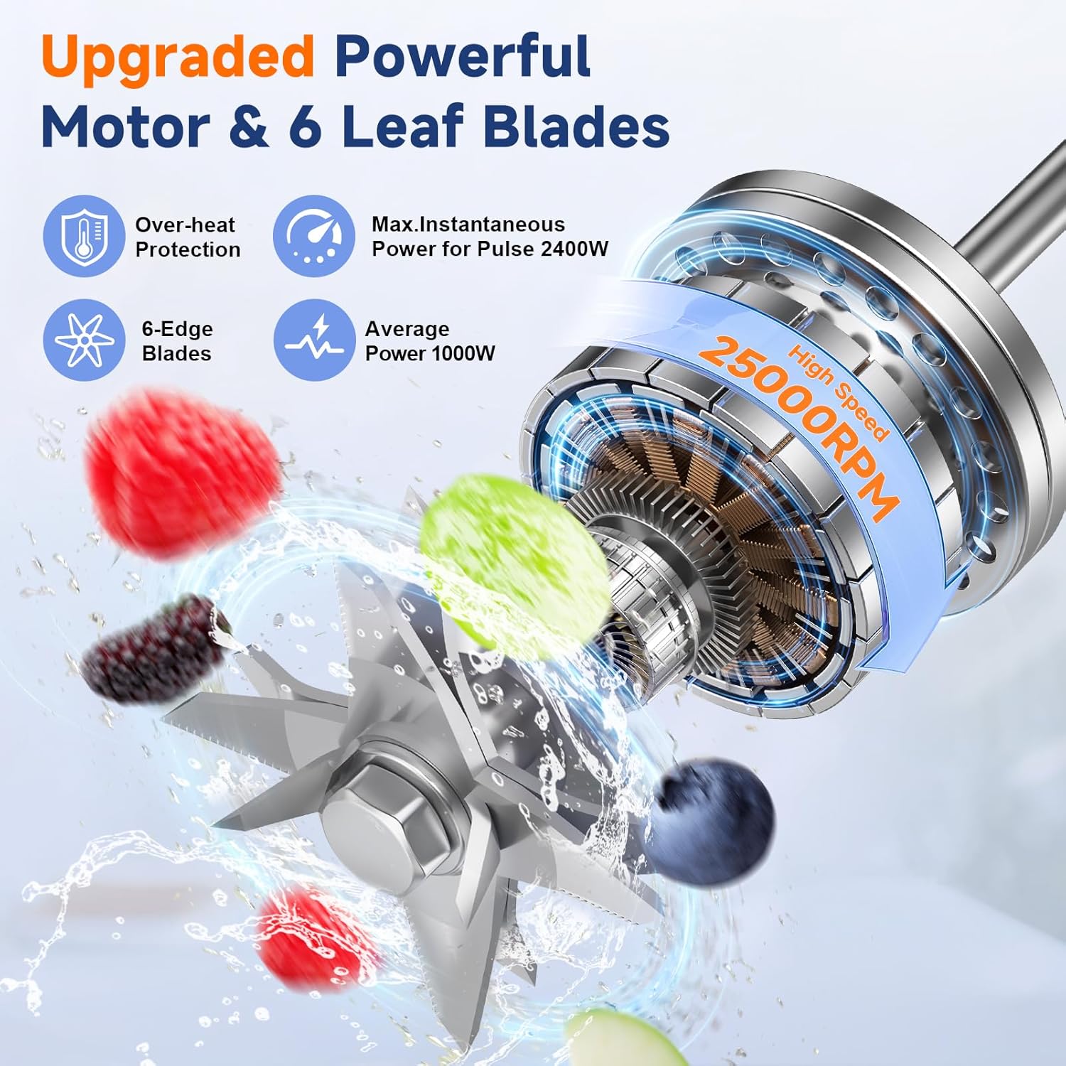 - Unrivaled 1000W Power & Ice-Crushing: Featuring 1000W base power with 2400W peak power and 25,000 RPM stainless steel 6-blade system. This smoothie blender instantly pulverizes ice, frozen fruits, and tough ingredients into velvety-smooth textures for smoothies, soups, and nut butters. Powerful blender built-in overheating protection for safety. Durable construction conquers daily kitchen challenges while preserving nutrients