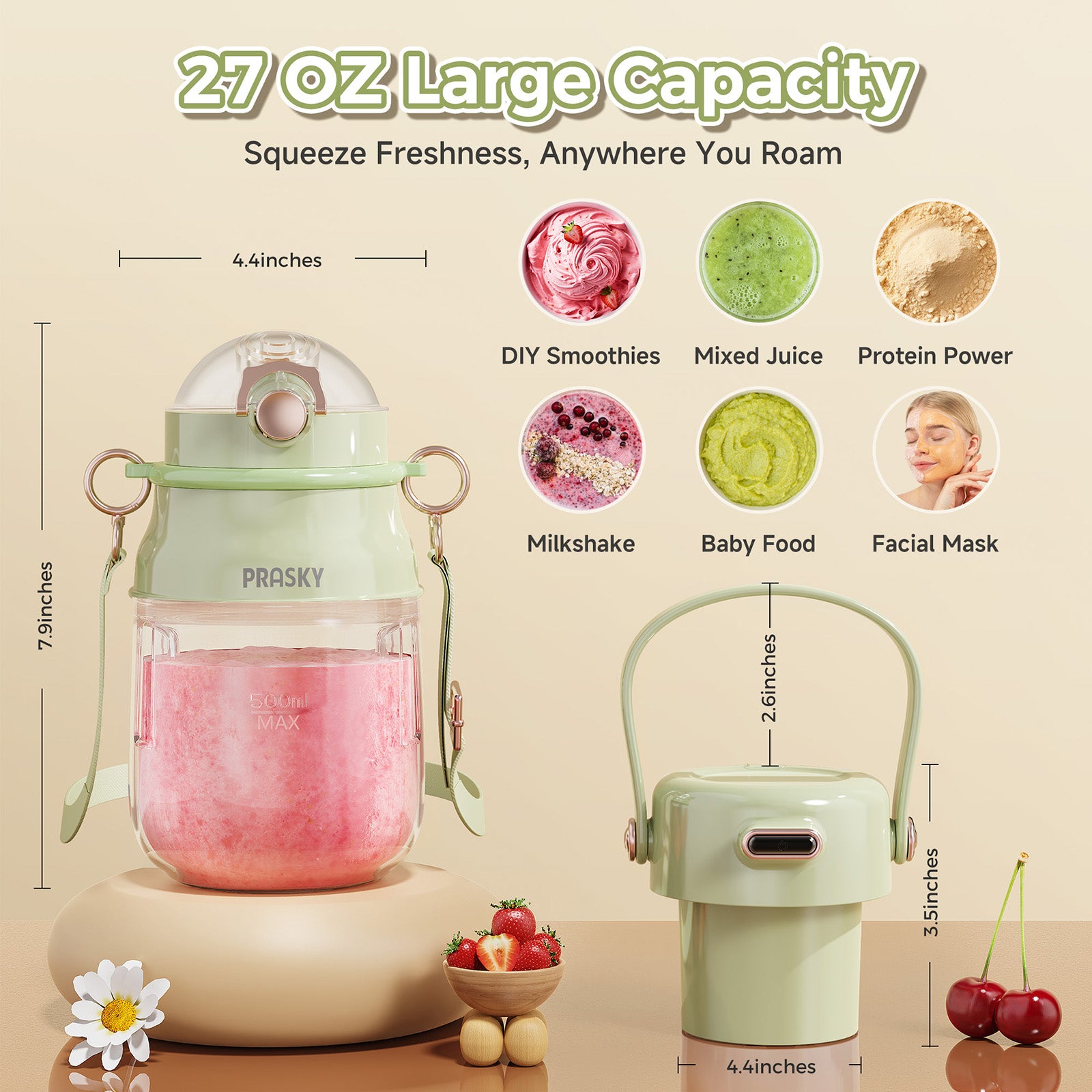 PRASKY Portable Blender, BPA Free 27oz for Juicer, Smoothies and Shakes (Green)