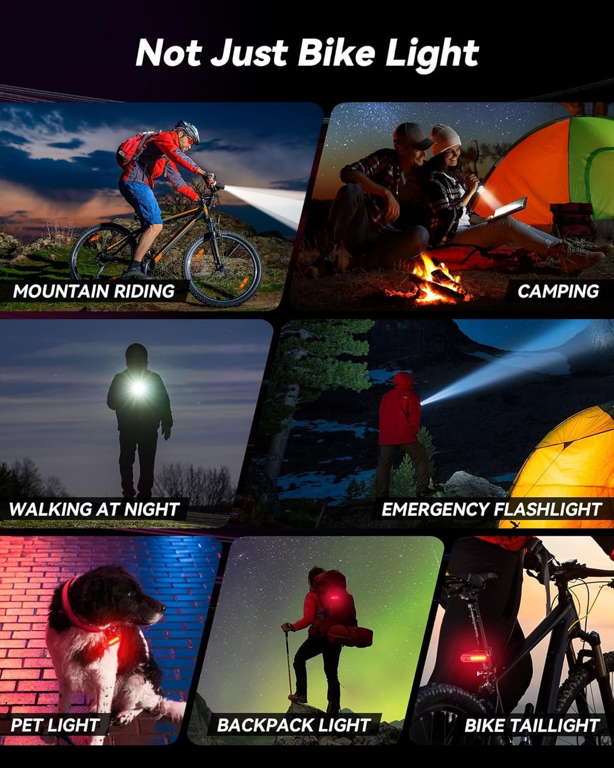 - Versatile Bike Lights: Bike lights front and back are ideal for mountain biking, hiking, running, commuting, electric biking, and walking pets. Bicycle lights also serve as emergency flashlights for outdoor adventures, camping, or unexpected situations, ensuring dependable lighting in various situations