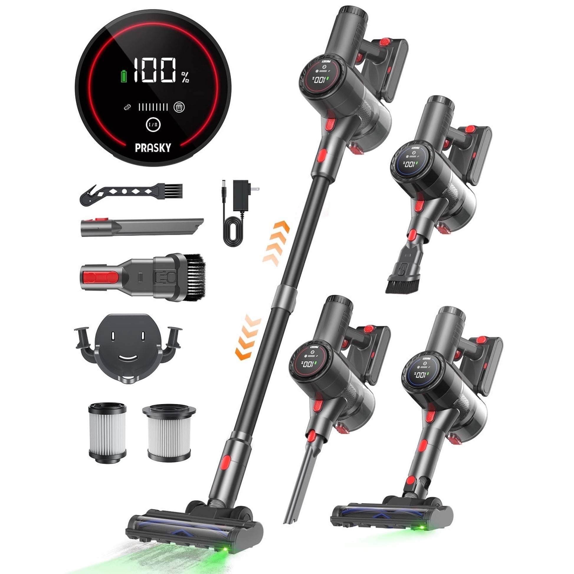 - Ture 250W/22KPa Powerful Suction - PRASKY cordless vacuum cleaner is equipped with a powerful motor, the strongest suction power can reach up to 22KPa in MAX mode, which can instantly pick up any dust, debris and large particles on the floor, the home vacuum cleaner can easily deep-clean the carpet, hardwood floors, marble floors and so on.