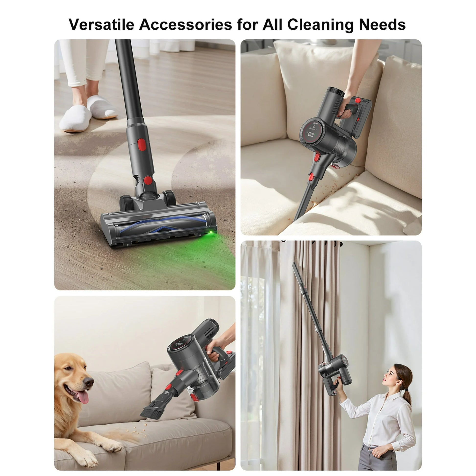 - All-in-One Multiple Heads for Every Floor - The home vacuum cleaner comes with a variety of attachments, including a floor brush, crevice tool, and a 2-in-1 combination brush. In addition to cleaning floors, tiles, and other surfaces, wireless vacuum cleaner can also reach narrow gaps behind cabinets, sofas, and other tight spaces. This ensures a thorough, corner-to-corner cleaning.