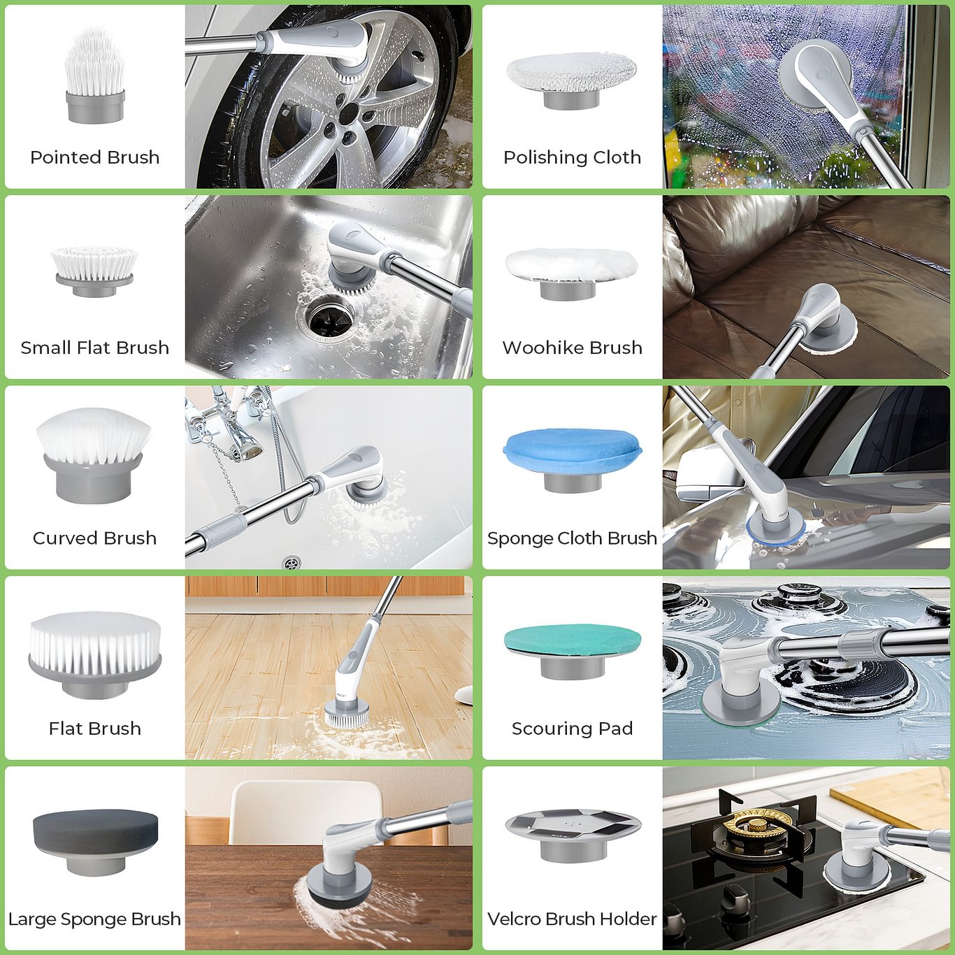 The electric spin scrubber is equipped with 9 replaceable multi-functional brush heads, a Velcro holder, hook for a longer lifespan. and space-saving storage bag. This floor scrubber can be used to clean a wide range of surfaces inside and outside. For example, cleaning shower rooms, narrow and hard-to-reach areas, glass, tile walls, car surfaces, kitchens, wheel hubs, car seats, furniture, windows, and more.