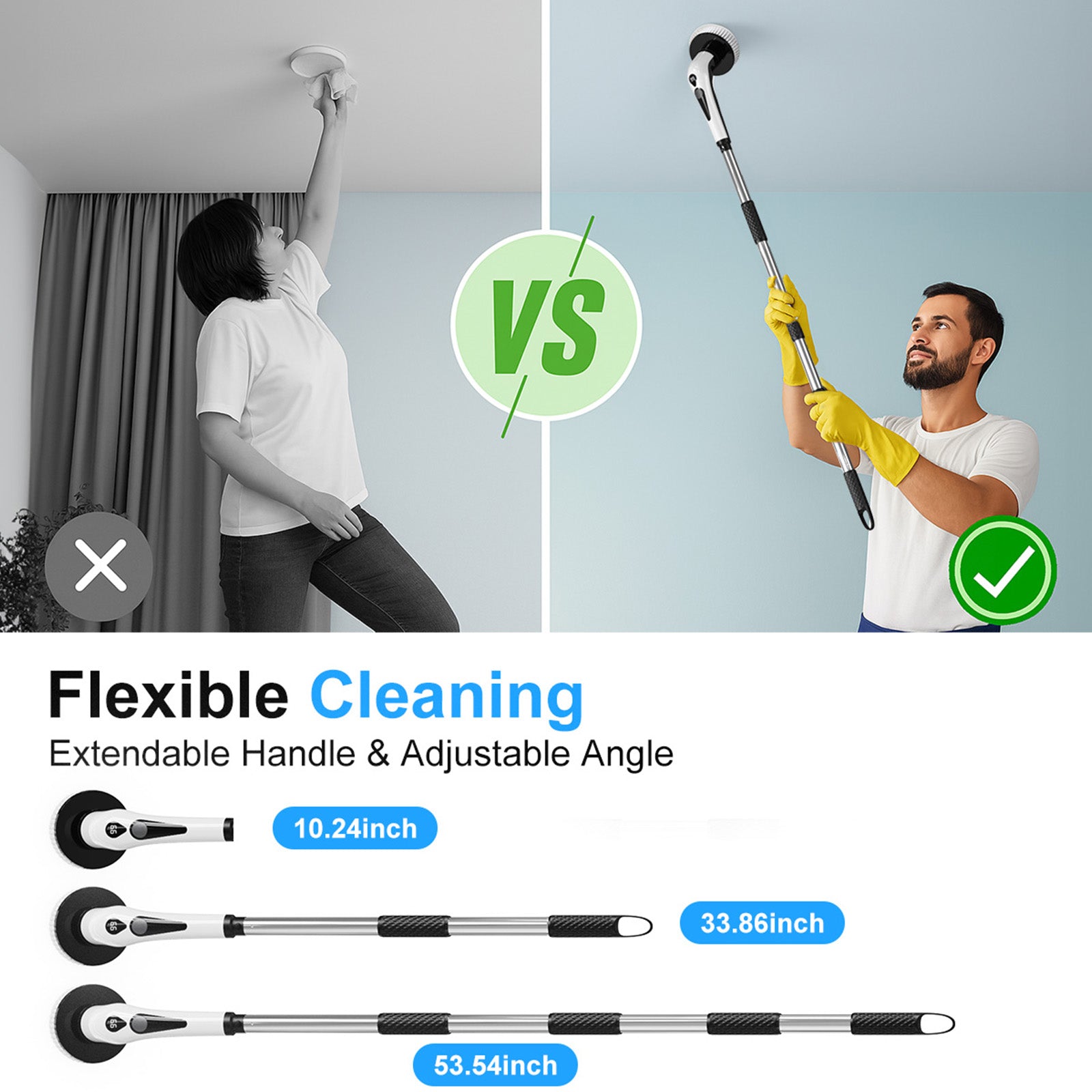【10.24-53.54in Detachable & Adjustable Mop 】PRASKY shower scrubber helps you get rid of laborious household cleaning, put the telescopic extension rod on and it will allow you to adjust the length of the spin scrubber from 10.24 inches up to 53.54 inches, which can help you clean the hard-to-reach places without bending and kneeling. Saving your back and knees by saying goodbye to the traditional clean way.