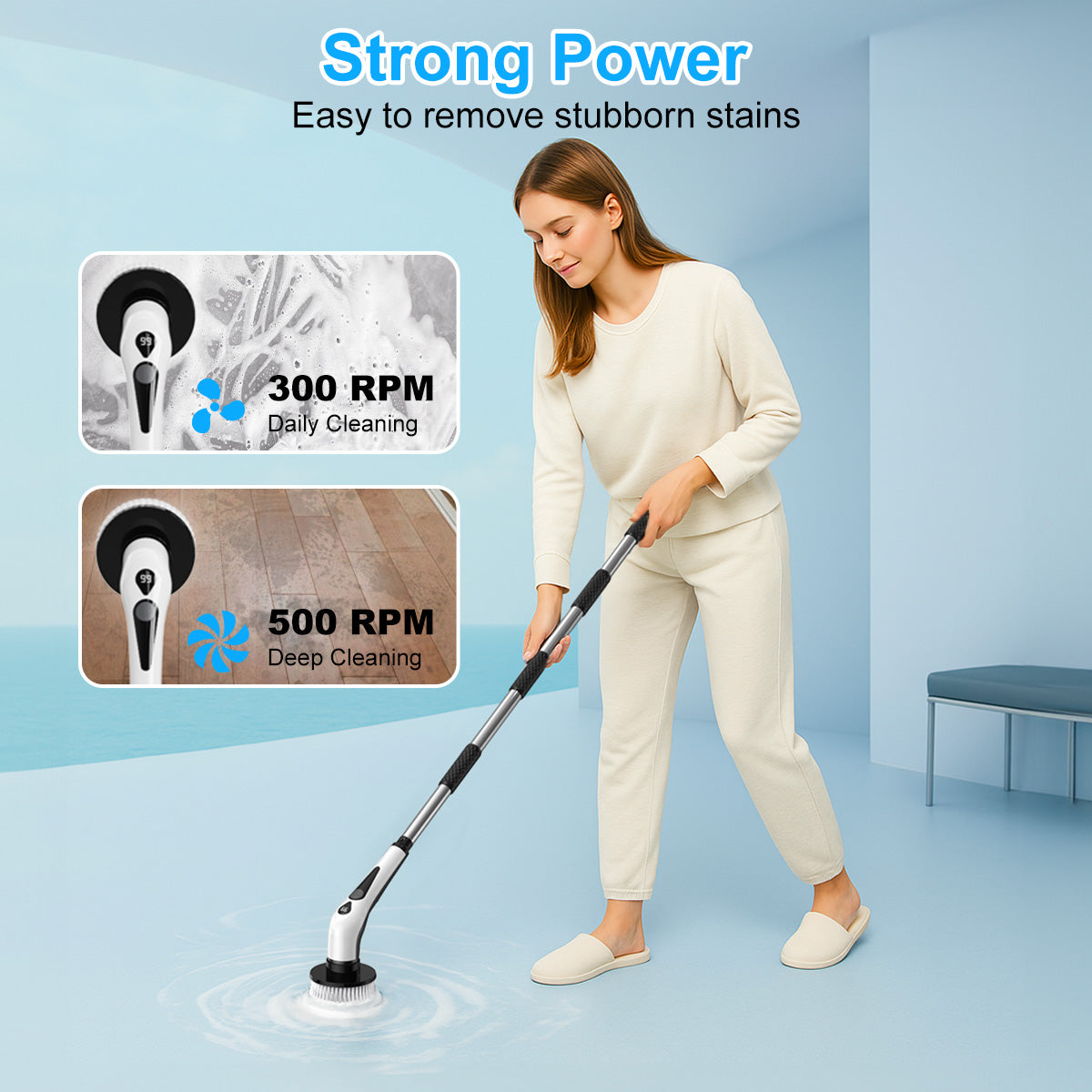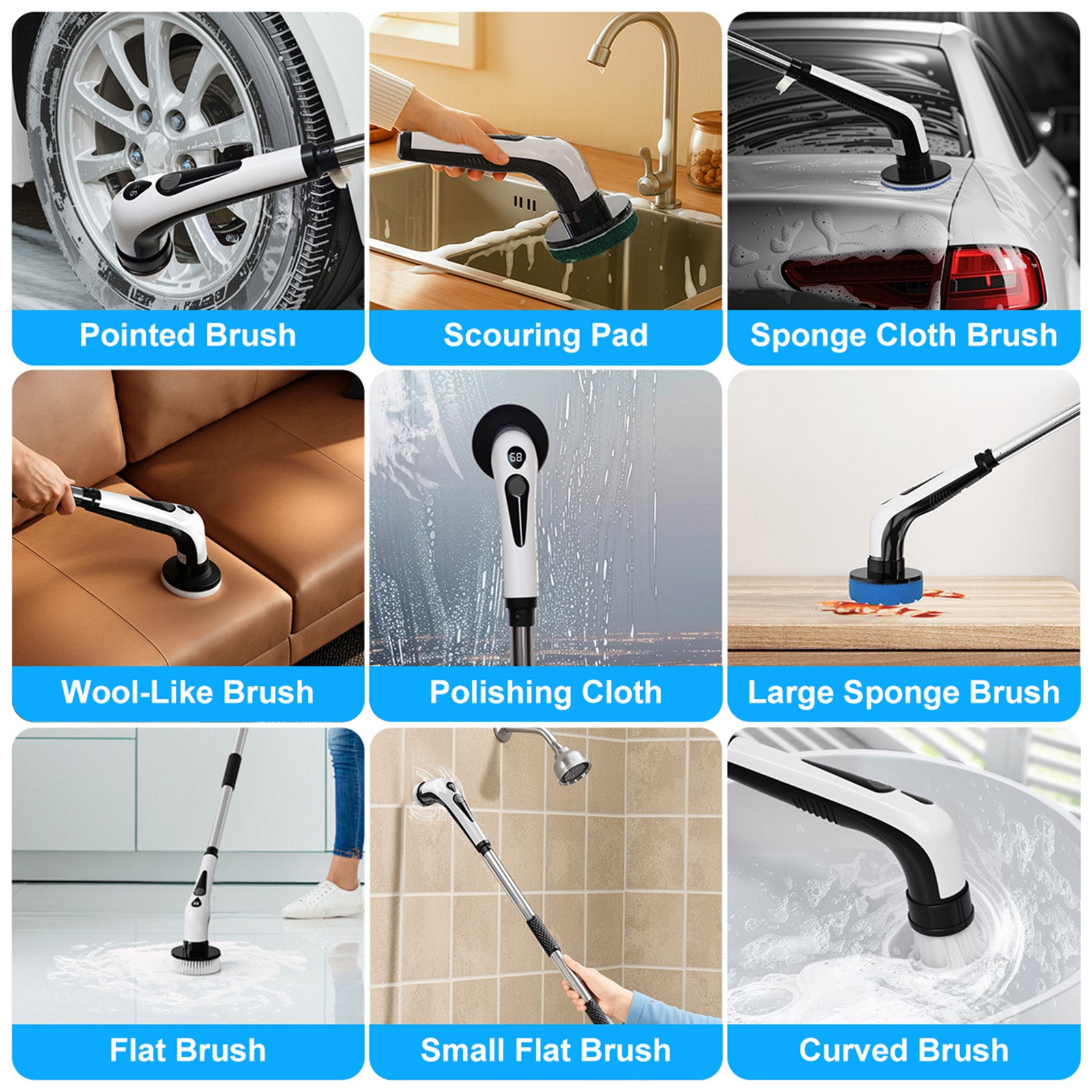 【10 Versatile Brush Heads 】PRASKY electric spin scrubber includes 10 replaceable cleaning brushes for various scenarios. Flat brush for surfaces like tile floor, wall, and pool; corner brush is great for cleaning grout, faucets, edges; cloth brush for wooden floor and furniture cleaning; the sponge is for the window. Moreover, you can even polish and wax your car with those heads.