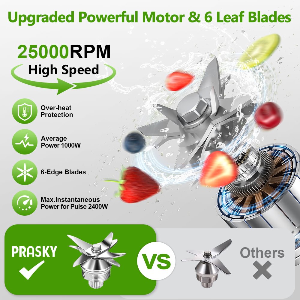 【High-Powered Performance】 PRASKY blender features a 3.0-hp motor reaching speeds of 25,000 RPM, with enhanced 6-leaf sharp blades to easily crush ice, fruits, and vegetables, ensuring faster, stronger blending for smoothies and shakes.