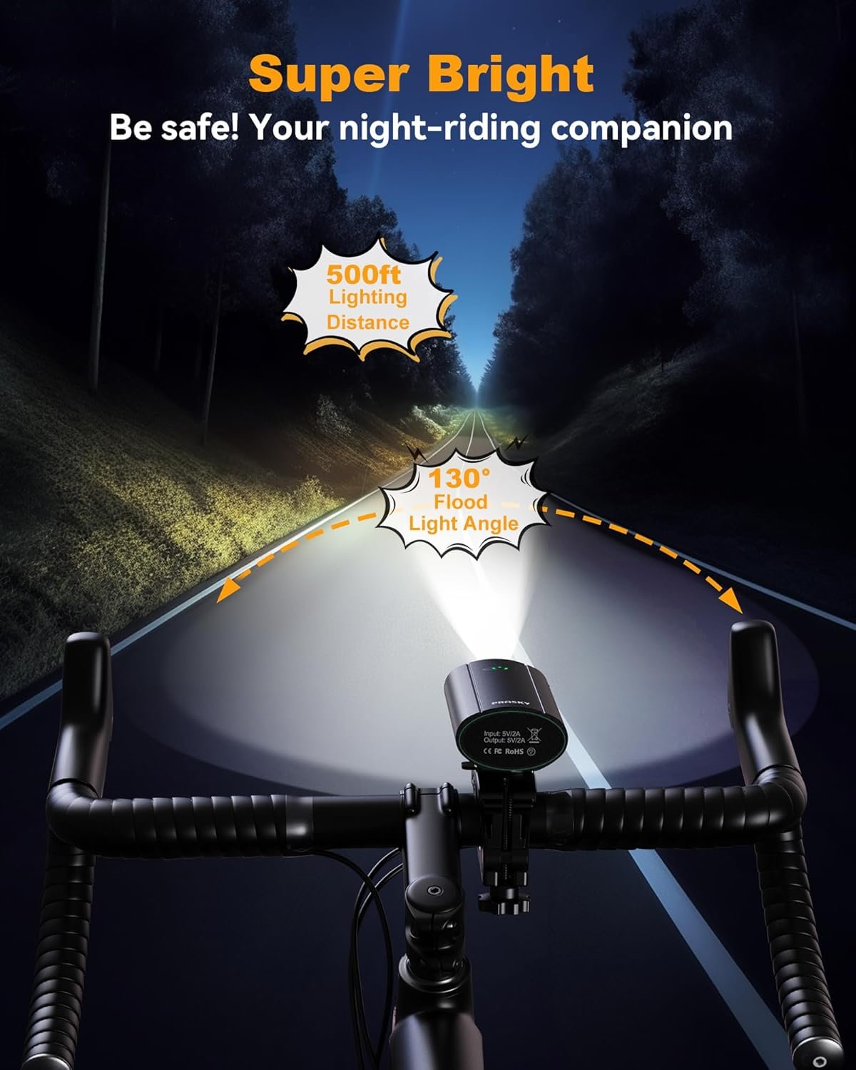 - High Brightness & Versatility: Boasting high lumens and an illumination range of up to 500 feet, bike lights double as a portable power bank, keeping you powered during your adventures. The red taillight ensuring you're seen from a distance. 360° adjustable bracket is compatible with bicycle diameters of 22-31.8mm