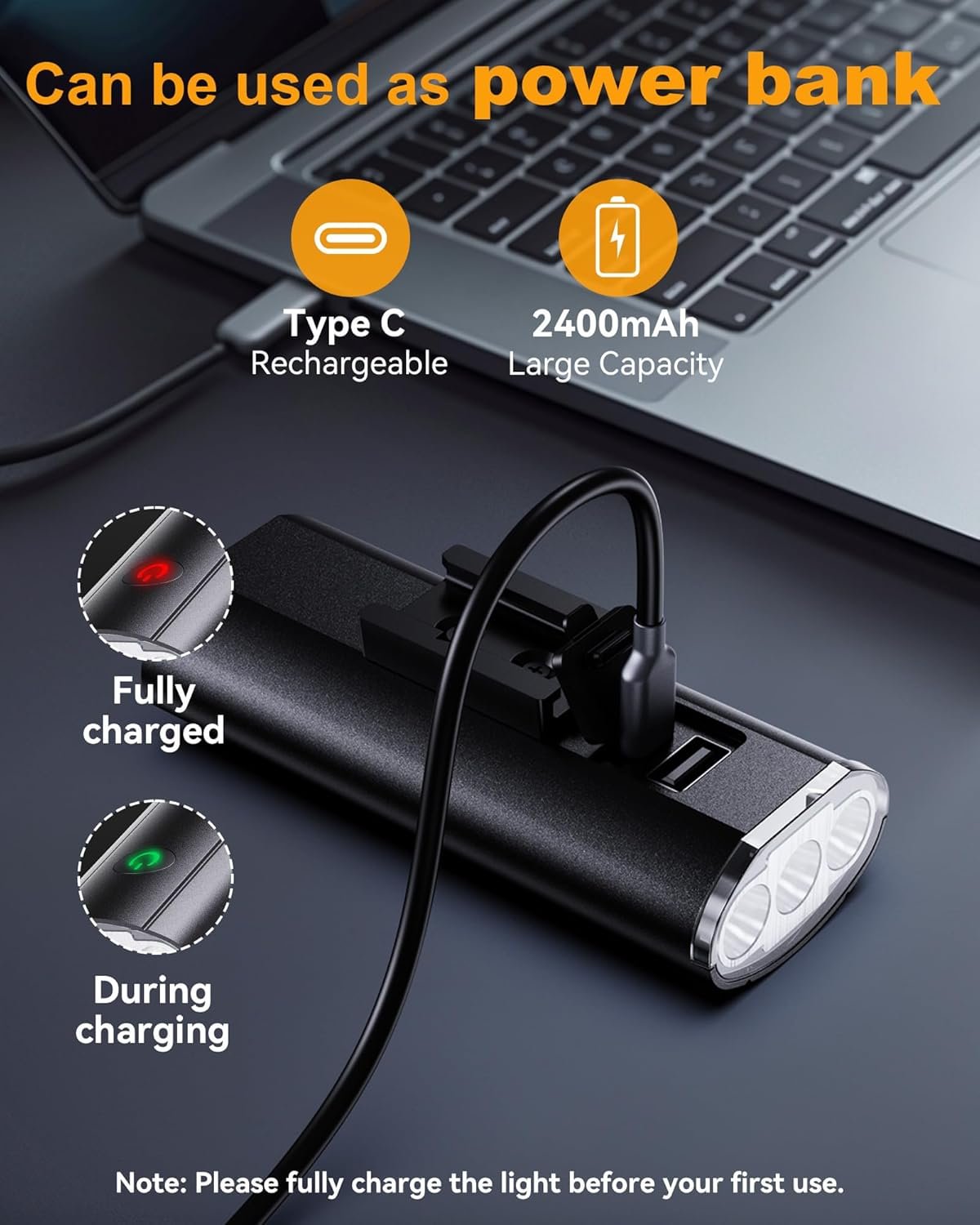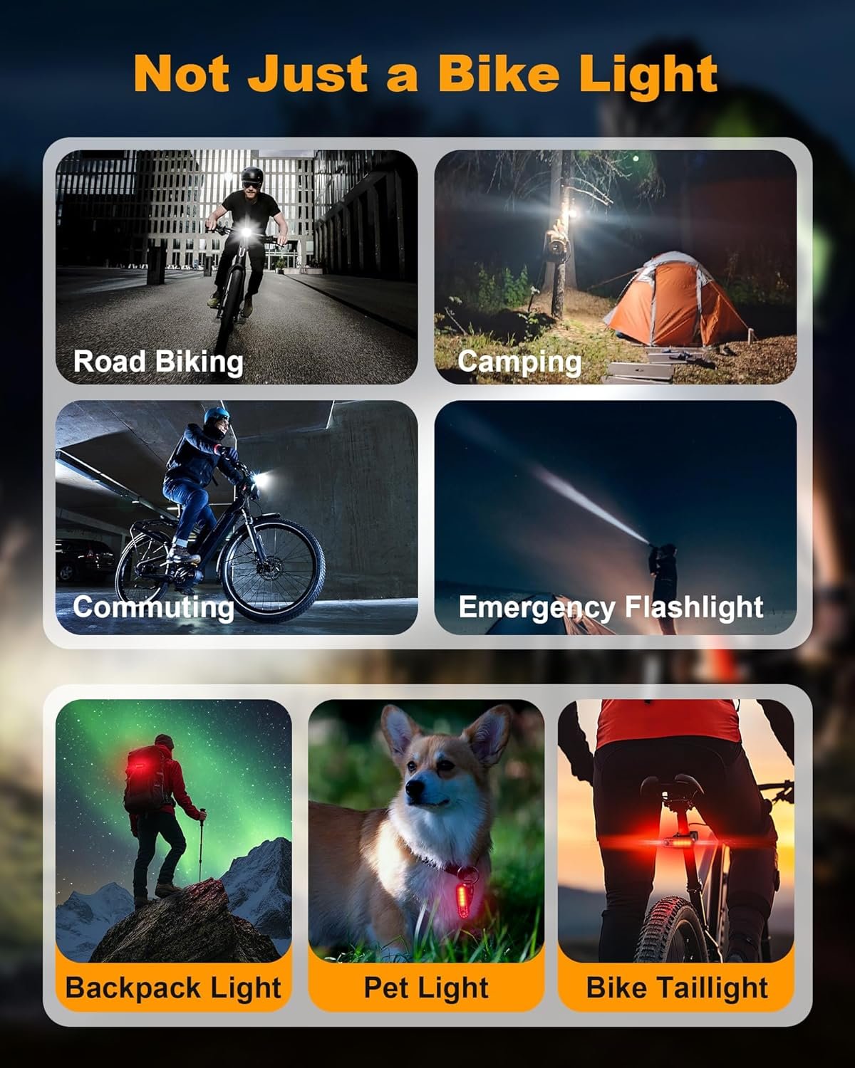 - Wide Range of Applications: Perfect for cycling, hiking, running, camping, walking pets, commuting, and mountain biking. Bike lights double as a portable power bank, keeping you powered during your adventures. Additionally, mountain bike light function as an emergency flashlight, offering peace of mind on the go