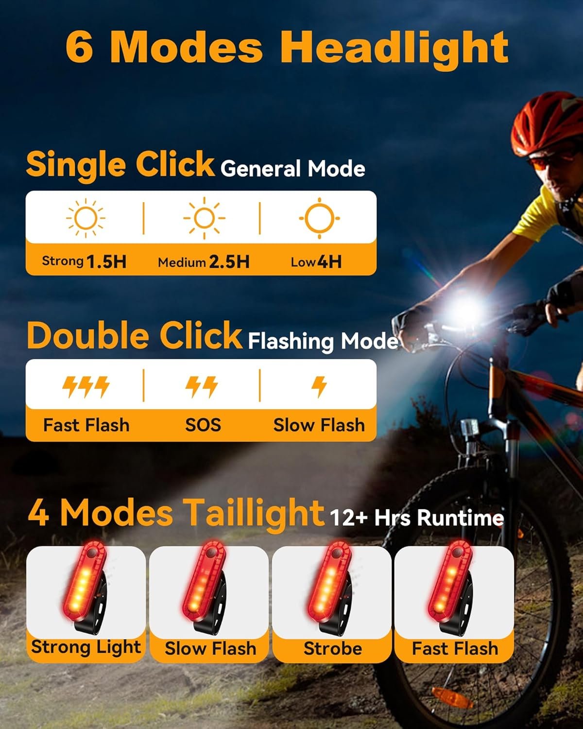 - 6+4 Lighting Modes: Bike headlight provides 6 modes (strong, medium, low, fast flash, SOS, slow flash), with a double click needed to access the flash modes. The tail light offers 4 modes (strong, slow flash, strobe, fast flash)