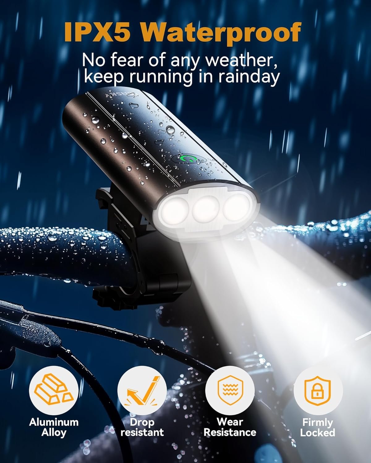 - Weather-Resistant and Durable: Featuring an IPX5 waterproof rating, these lights are ideal for use in rainy or snowy conditions. The all-metal body of the bicycle headlight constructed from high-quality aluminum alloy, bicycle lights are built to endure impacts, drops and resist wear. Bike lights for night riding prevents oxidation and discoloration, even with prolonged exposure to sunlight and rain